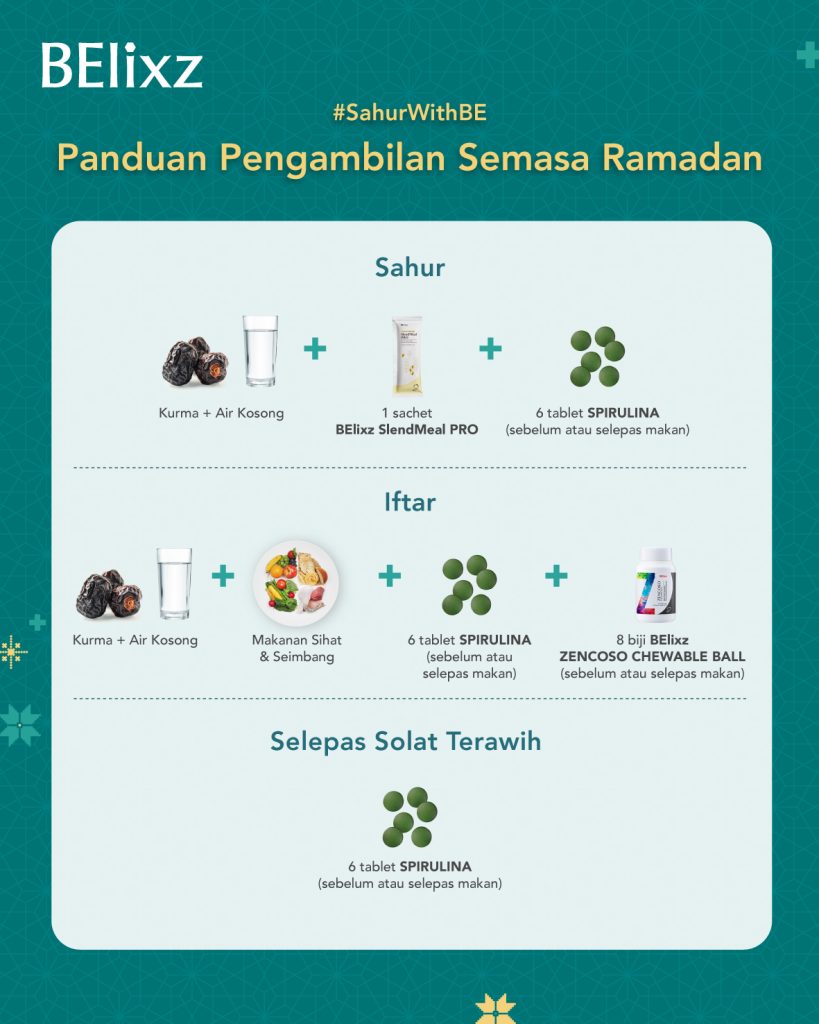 Nikmati BElixz SlendMeal PRO, Spirulina dan BElixz ZENCOSO CHEWABLE BALL dengan cara yang bijak sepanjang Ramadan ini.