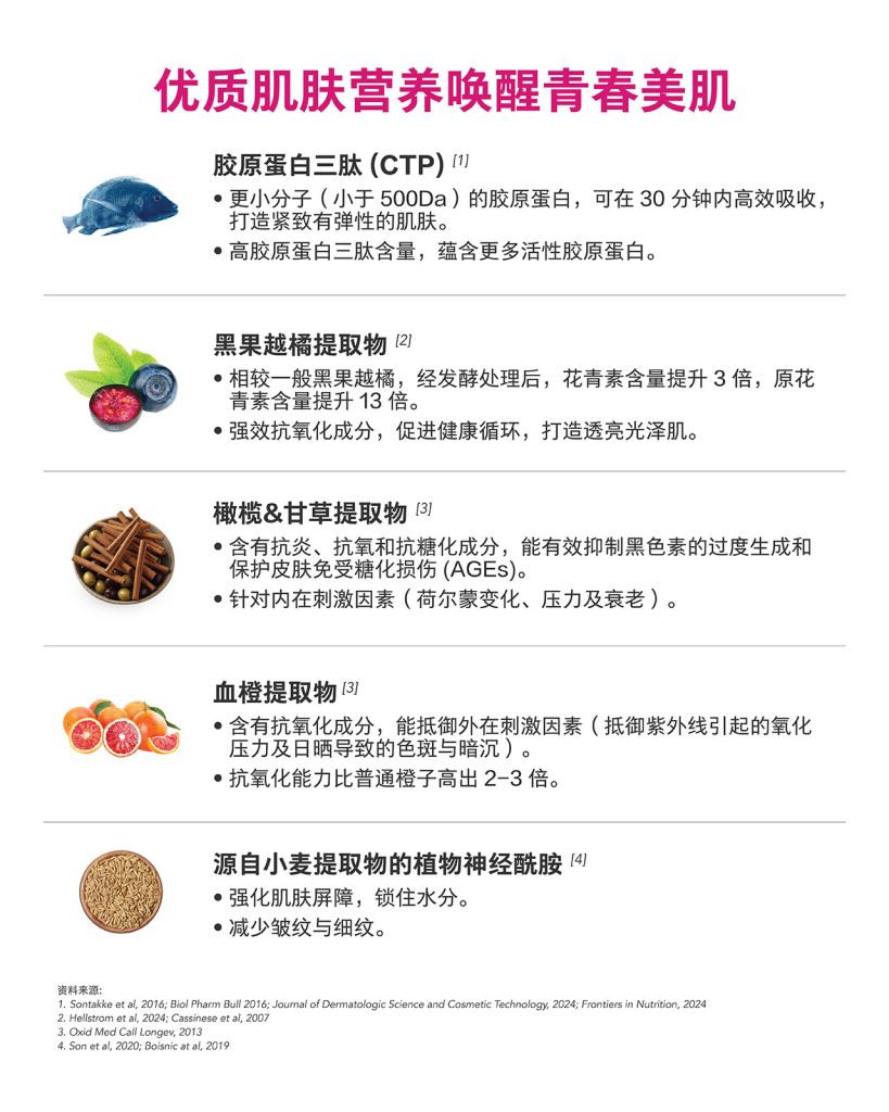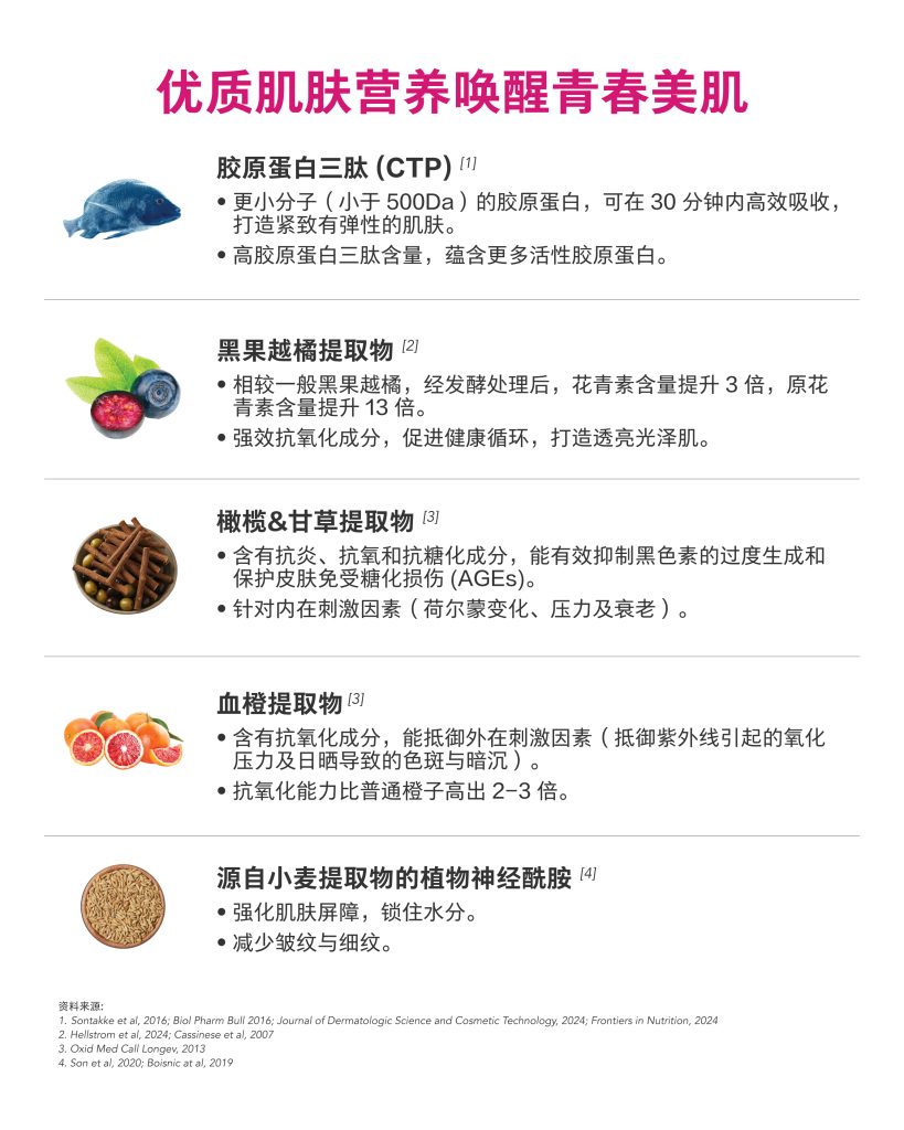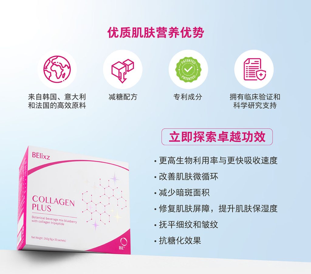一款突破性胶原蛋白饮品,采用专利先进的胶原蛋白三肽配方,并结合专有植物萃取抗氧化复合成分,为肌肤带来更卓越的保养效果。BElixz COLLAGEN PLUS 有助于打造紧致、有弹性的肌肤,焕发透亮光泽,并维持细致无瑕的肤质。每日轻松补充,由内而外滋养,展现健康年轻的肌肤状态。